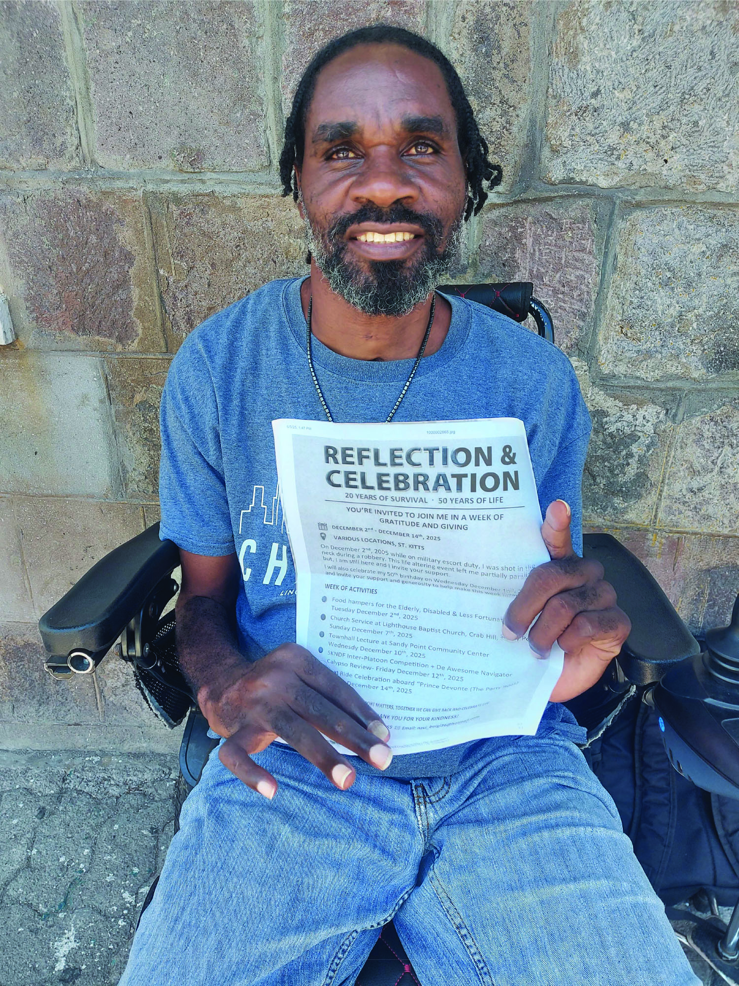 BASSETERRE, St. Kitts (Thursday 4th September 2025)-As he approaches both the anniversary of his life-changing injury and his next birthday, 49-year-old Joseph Bergan of Sandy Point, a former soldier better known in the calypso world as ‘De Awesome Navigator’, is inviting the nation to join him in a week of gratitude and giving under the theme: ‘Reflection & Celebration: 20 Years of Survival- 50 Years of Life.’